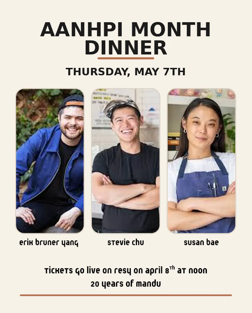Next up on Thursday, May 7th, we have award winning Chefs Erik Bruner Yang, Stevie Chu, and Susan Bae joining us to help kick off AANHPI Month! Seatings take place between 5:30 pm to 8:45 pm, click the link below to secure your spot: